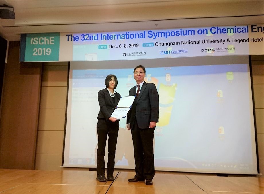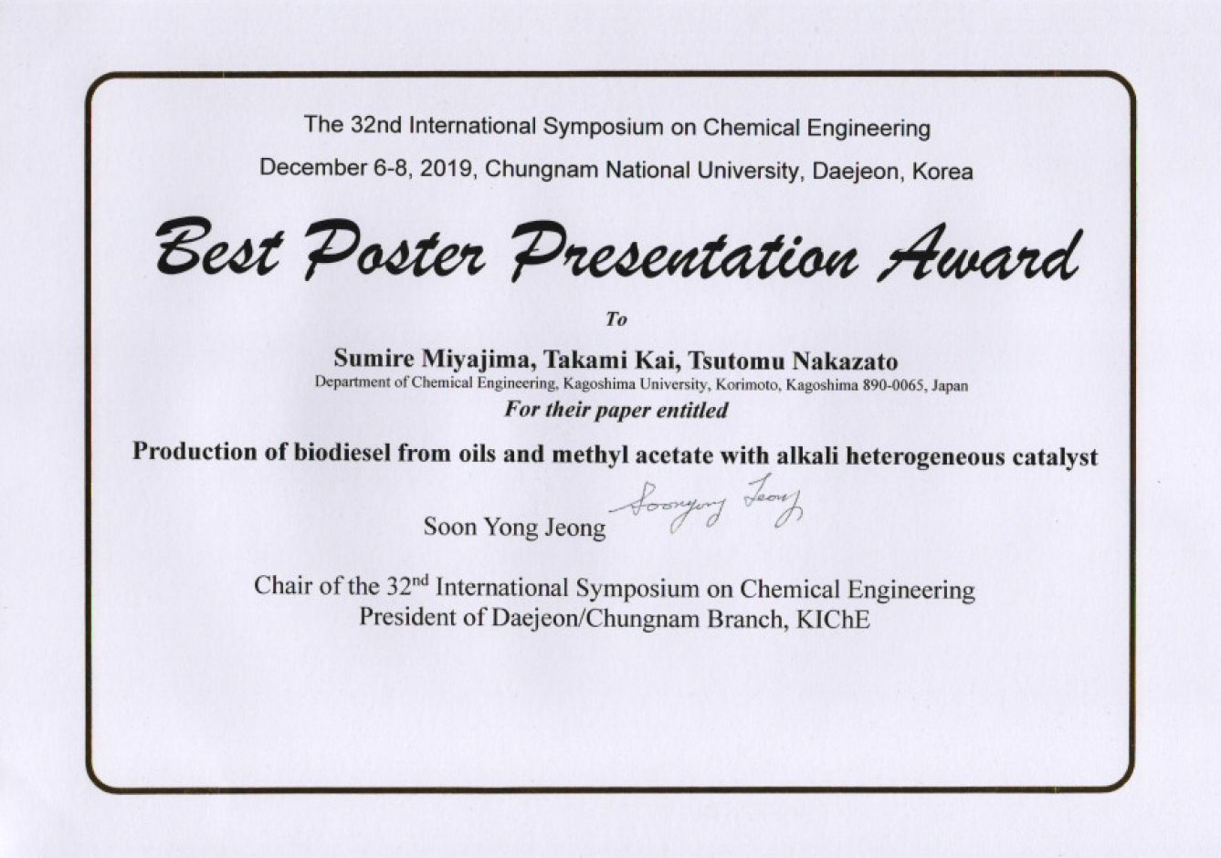 令和元年12月7日にChungnam National University(大田、韓国)で開催された「The 32nd International Symposium on Chemical Engineering」において、理工学研究科 化学生命・化学工学専攻(化学工学コース)2年の宮島菫さん(甲斐研究グループ)が107件のポスター発表のうち3件の優れた発表に授与された「Best Poster Presentation Award」に選ばれました。