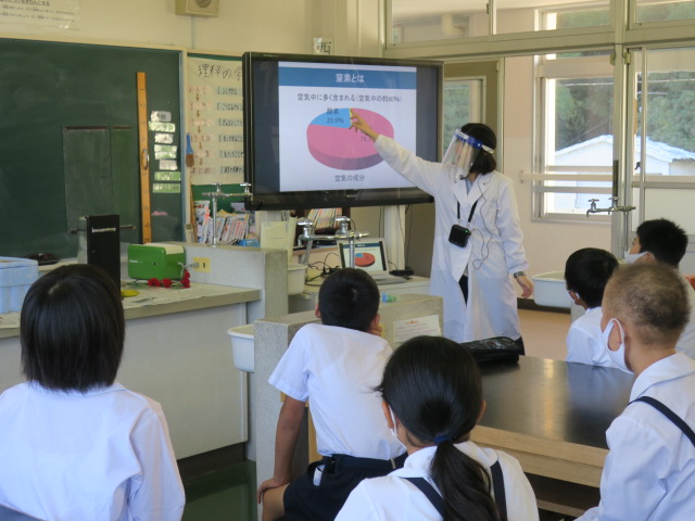 今回は、技術部から職員4名が出向き、前之浜小学校5・6年生9人の児童に対して、科学実験「液体窒素でおもしろ実験」を実施しました。