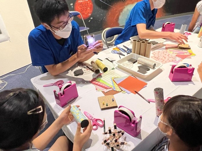 今年度の科学の祭典では、昨年と同様に事前予約制で実施され、午前の部と午後の部に分かれ、それぞれの部で500名の人数制限にて行われました。技術部のブースでは300人の子どもたちが万華鏡づくりを楽しみ、保護者の方も含め400人以上の地域の方々と交流することができ、参加した職員や協力してくれたボランティアの学生にとって充実した時間となりました。