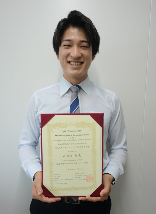 海洋土木工学プログラム博士前期課程2年の小金丸裕史さん(指導教員:加古真一郎教授)が、2024年5月30日に開催された日本地球惑星科学連合2024年大会において、学生優秀発表者賞を受賞しました。今回受賞したテーマは「大島海峡の高分解能予報モデルの構築」です。