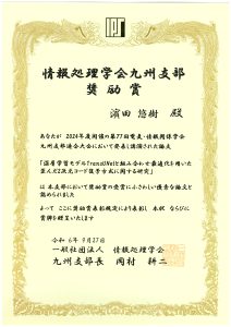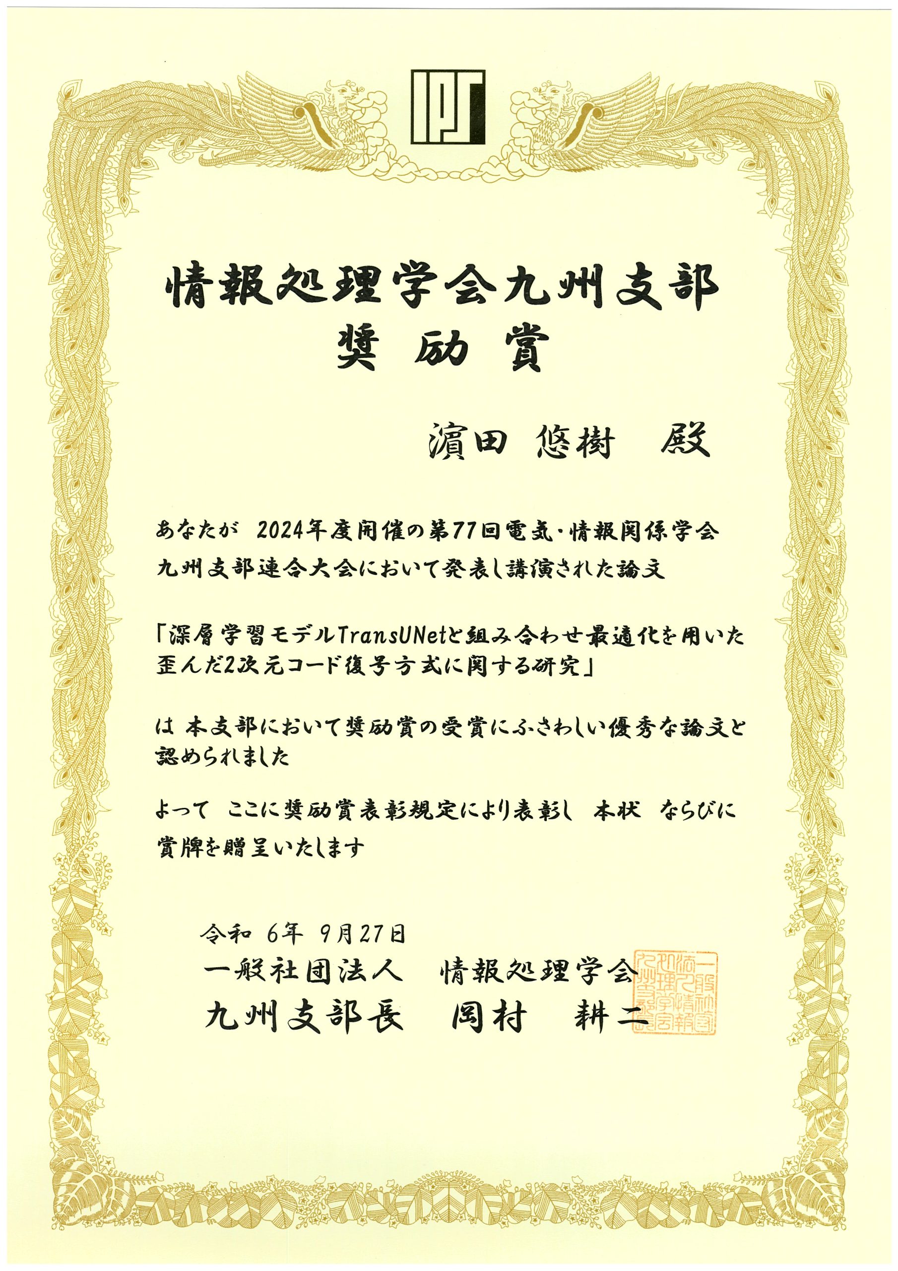 2024年9月26日(木)~9月27日(金)に鹿児島大学 郡元キャンパスで開催された「2024年度第77回電気・情報関係学会九州支部連合大会」において、本PGの博士前期課程2年の濵田悠樹さん(指導教員:小野智司教授)が「奨励賞」を受賞しました。同賞は、情報処理学会九州支部より、全講演件数353件のうち35歳以下の若手研究者及び技術者、学生を対象とした優秀な論文を発表した6名に授与されました。