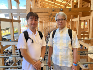 高隅演習林の木材を使用した大屋根リングにて(左から金子先生、井戸学長)