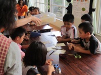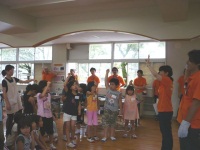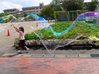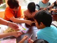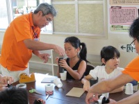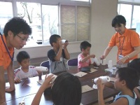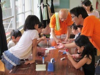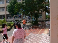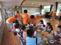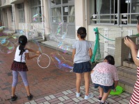 その後、各学年に分かれて「シャボン玉」「葉脈標本しおり」「光の万華鏡」作りを楽しみました。時折雨の降る中、弾むシャボン玉や大きなシャボン玉に歓声を上げながら楽しみ、葉脈を使ったオリジナルのしおりを作製し、光の万華鏡を通して光の分光等を学びました。子どもたちは、技術職員の指導を熱心に聞き、積極的に質問するなど、夏休みの最後に良い思い出となりました。