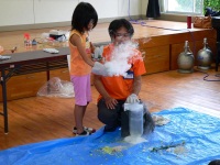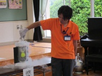 最初に毎回恒例の「液体窒素のおもしろ実験」を行い、さまざまな物を浸して凍らせバラバラになったバラや、大きな音をたて粉々になるゴムボールの実験に子どもたちは一喜一憂していました。