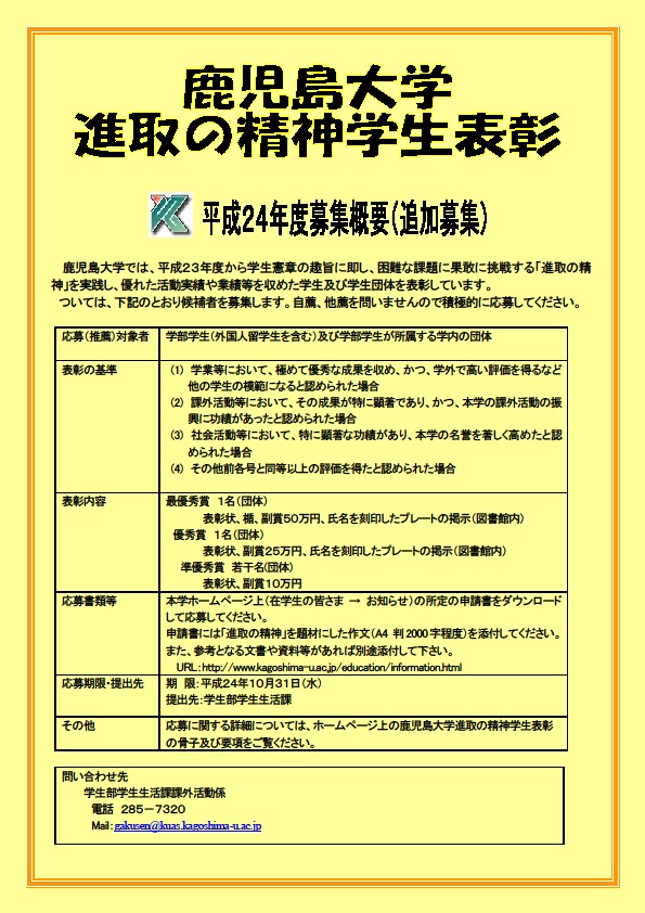 > 平成24年度鹿児島大学進取の精神学生表彰(追加募集)