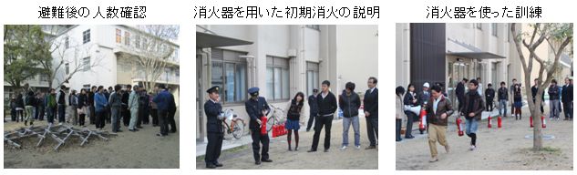 今回は応用化学工学科1号棟から出火したとの想定で訓練が行われ、教職員・学生の避難が完了した後、各学科の学生や教職員が消火器実地訓練を行いました。