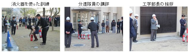 工学部では、3月4日(月)に消防訓練を実施しました。この訓練は、火災予防に関する意識の向上を図ると共に、自主防火体制におけるそれぞれの任務を再認識させて、火災発生時の通報連絡・初期消火・避難誘導に係る連携動作の習熟を図ることを目的に行っているものです。