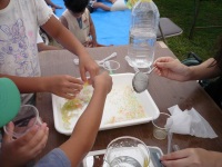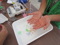 技術部からは「人工イクラ」をテーマとして参加しました。これは、アルギン酸ナトリウムと塩化カルシウムを混ぜ合わせることで、人工的にイクラをつくる実験で、今回は絵の具で様々な色をつけたカラフルイクラを作成しました。