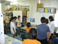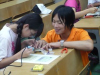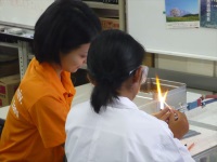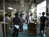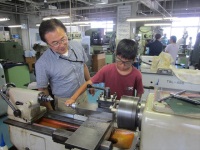 プログラムは「ペーパーウェイトをつくろう」「フルカラーLEDをつくろう」「ガラスマドラー作りとグラス彫刻」の3つがあり、それぞれ事前に申し込んだプログラムに別れて作業を始めました。「ペーパーウェイトをつくろう」では、旋盤などの大きな機械を操作して、材料の真鍮を削ったり穴を開けたりして最後にはピカピカに磨いて完成させました。「フルカラーLEDをつくろう」では、はんだごてを使って電子回路を作り、フルカラーLEDを作成しました。難しいところもありましたが、みんな真剣に説明を聞き作成していました。「ガラスマドラー作りとグラス彫刻」では、ガスバーナーを使用してガラスを溶かしたり、ルーターでグラスに彫刻したりして、それぞれの作品を作り上げていました。どれも危険の伴う作業がありましたが、みんな技術職員の指導を受け、一生懸命に取り組んでいました。