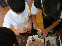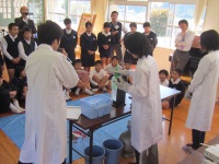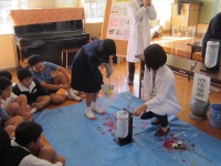 今回は小山田小学校の5,6年生約30名と先生方が参加。まずは、参加者全員の前で「液体窒素でおもしろ実験」を行いました。液体窒素によってバラやバナナがカチコチに凍ったり、風船がしぼんだりするのを子どもたちは興味津津に見つめ、最後には数人がバラを凍らせる体験をし、「こんなに簡単にバラバラになるとは思わなかった」と驚いていました。