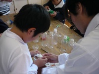 続いて、3つのグループに分かれて「人工イクラ」「光の万華鏡」「ペットボトル空気砲」を作成しました。「人工イクラ」では、作ったイクラを触ったり軍艦に乗せたり細長く作ってみたりと、それぞれ自由にその不思議さを楽しみ、「光の万華鏡」では細かい作業に苦戦しながらも自分だけの作品を作り上げ、部屋の電気とLEDから見える光の違いに驚き夢中になっていました。「ペットボトル空気砲」では、ペットボトルを頑張って切り出来上がった空気砲で空気の弾をだしあったり、また段ボール製の大きな空気砲でろうそくの火を消す体験を行ったりと大いに盛り上がっていました。
