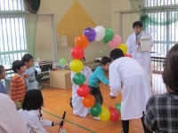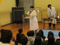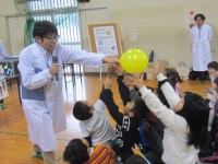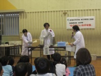 今回は三和児童センターの子どもたち約30名と先生方が参加し「液体窒素でおもしろ実験」と「空気で遊ぼう」の2つの演示を行いました。