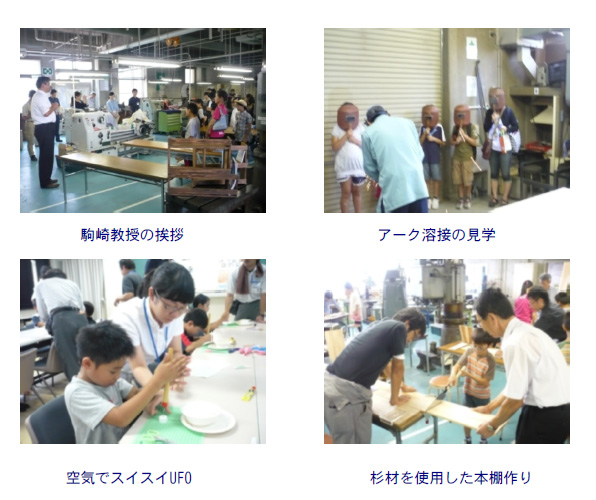 駒崎教授の挨拶の後、工学部(中央実験工場)にある機械類の「旋盤」「フライス盤」と、「アーク溶接」について理工学研究科の技術職員から説明を受け、実際の動きなどを見学しました。その後「空気でスイスイUFO」と「杉材を使用した本棚作り」のそれぞれのコースに分かれ、技術職員の指導のもと楽しく作業をして、およそ2~4時間かけて完成させました。
