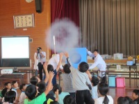 今回は、皇徳寺小学校の4年生約80人と先生方が参加し、科学実験として「空気で遊ぼう」と「液体窒素でおもしろ実験」、ものづくりとして「ペットボトル空気砲をつくろう」を行いました。