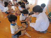 今回の出前授業には、鹿児島大学のマスコットキャラクターである「さっつん」が参加してくれました。「さっつん」も空気の実験に参加し、子どもたちとたくさんのふれあいがありました。