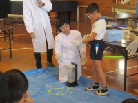 「液体窒素でおもしろ実験」では、パワーポイントを使って説明をしながら実験を行いました。バナナや風船等を液体窒素につけて変化を観察したり、液体窒素を床にばらまいたりと様々な実験を行いました。子どもたち数人には、実際に生花を液体窒素に入れる体験をしてもらいました。