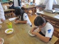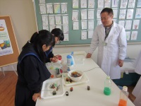 今回は、小山田小学校の5,6年生35人と先生方が参加し、科学実験として「液体窒素でおもしろ実験」・「人工イクラをつくろう」・「再結晶」を、ものづくりとして「葉脈標本しおりをつくろう」を行いました。