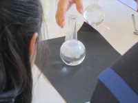 演示形式で行った「液体窒素でおもしろ実験」では、スライドを使って説明をしながら実験を行いました。生卵に液体窒素をかけたり、液体窒素を床にばらまいたりと様々な実験を観察しました。また、子どもたち数人が、実際に生花を液体窒素に入れて実験を体験しました。