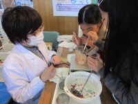 「人工イクラをつくろう!」では、様々な色や形のイクラを作り、その中から好きなものをプラスチック容器に入れて持ち帰りました。子どもたちはきれいな形のイクラを選んだり、細長いイクラをつめたりと、それぞれに楽しんでいました。